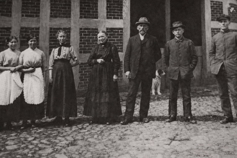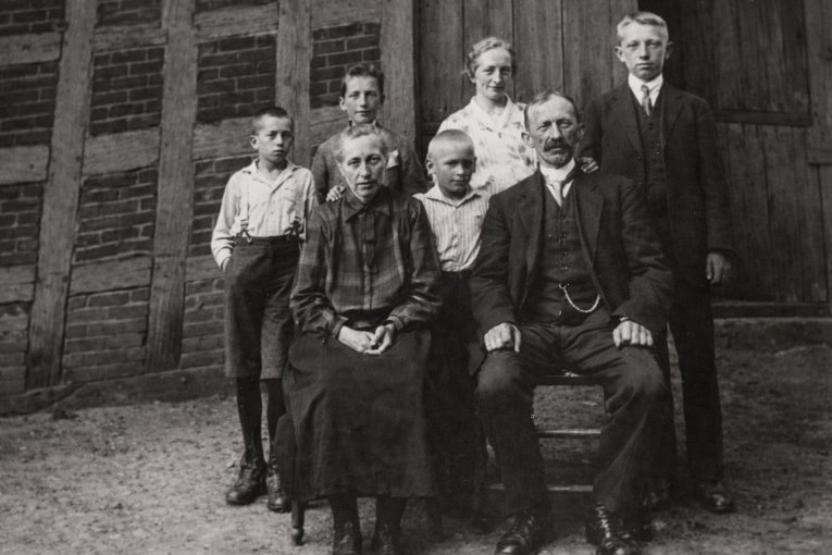 Familie Rosenbrock >Jocobs< vor dem Giebel ihres Hauses um 1900