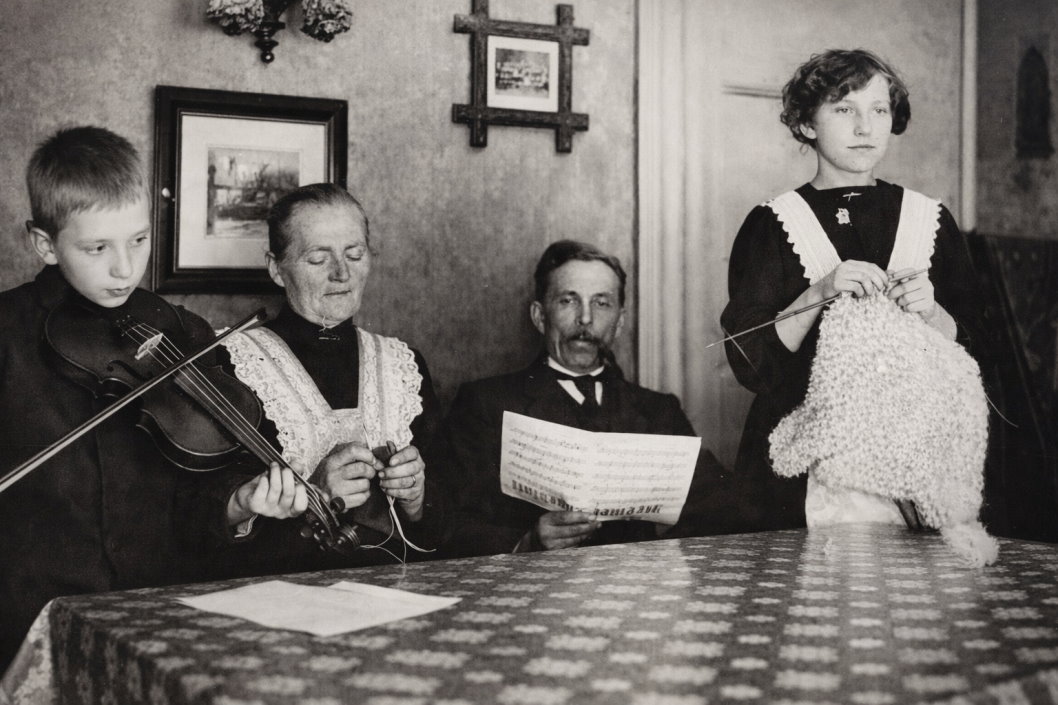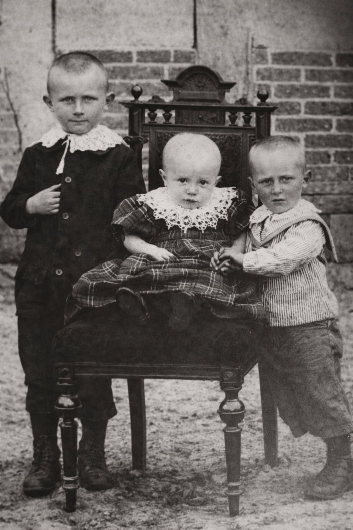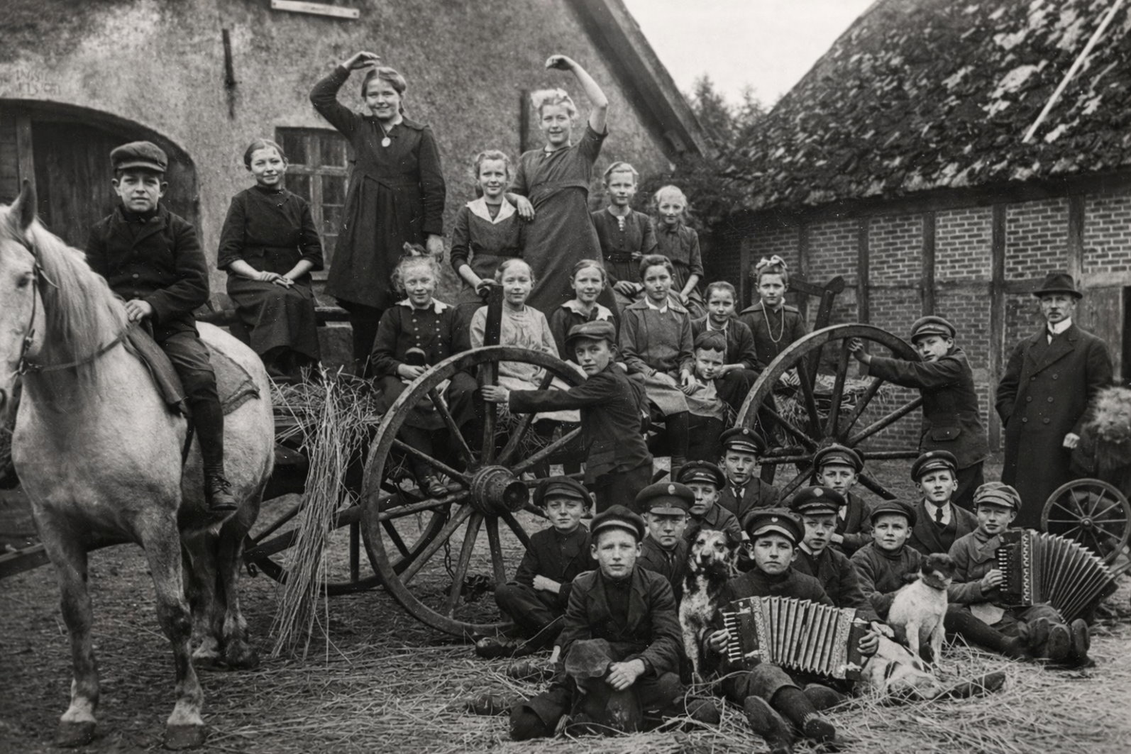 Lehrer Fröhlich mit Schulkindern vor Lemmermanns Haus um 1917