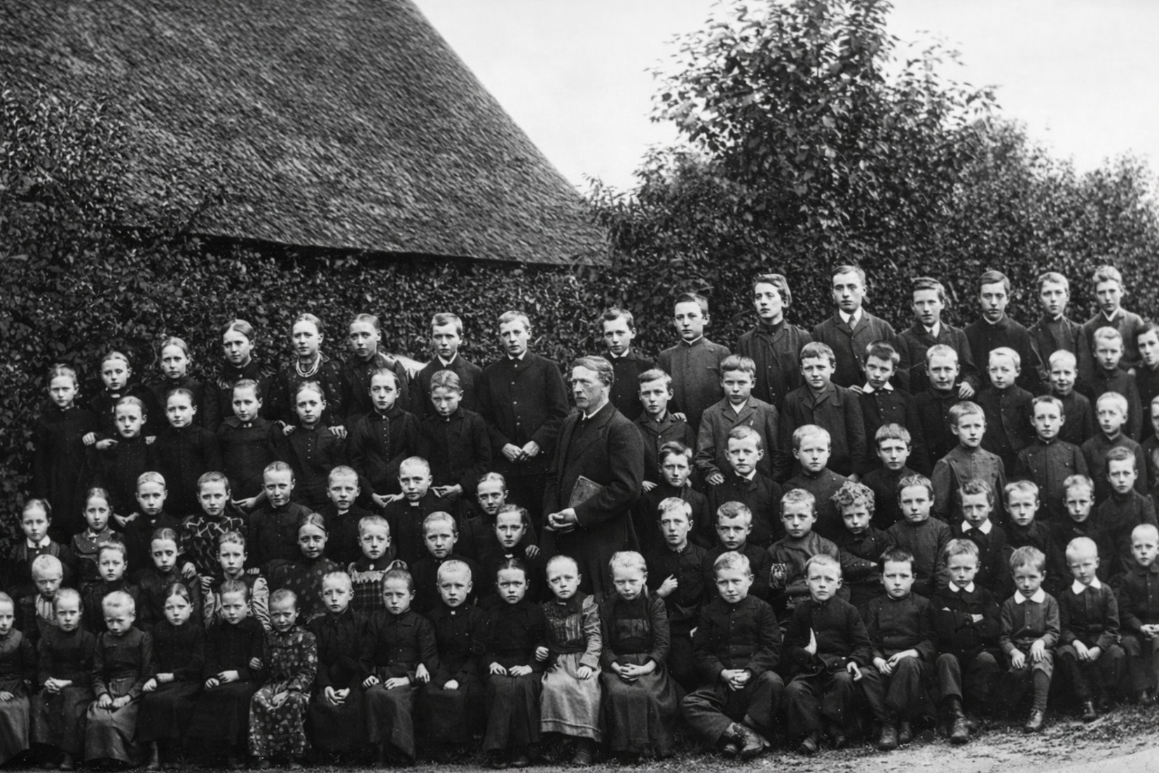 Lehrer Joachim Brandt mit Schulkindern der Jahrgänge 1880-1888, die er ganz allein unterrichtete