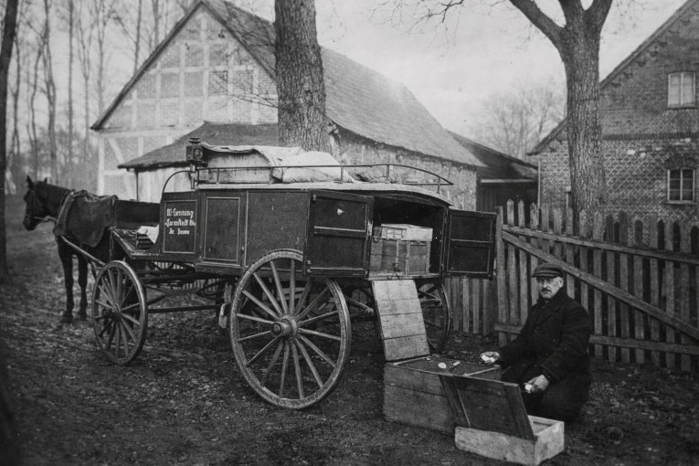 Mobiler Eierhändler Wilhelm Henning mit seinem Gespann um 1930